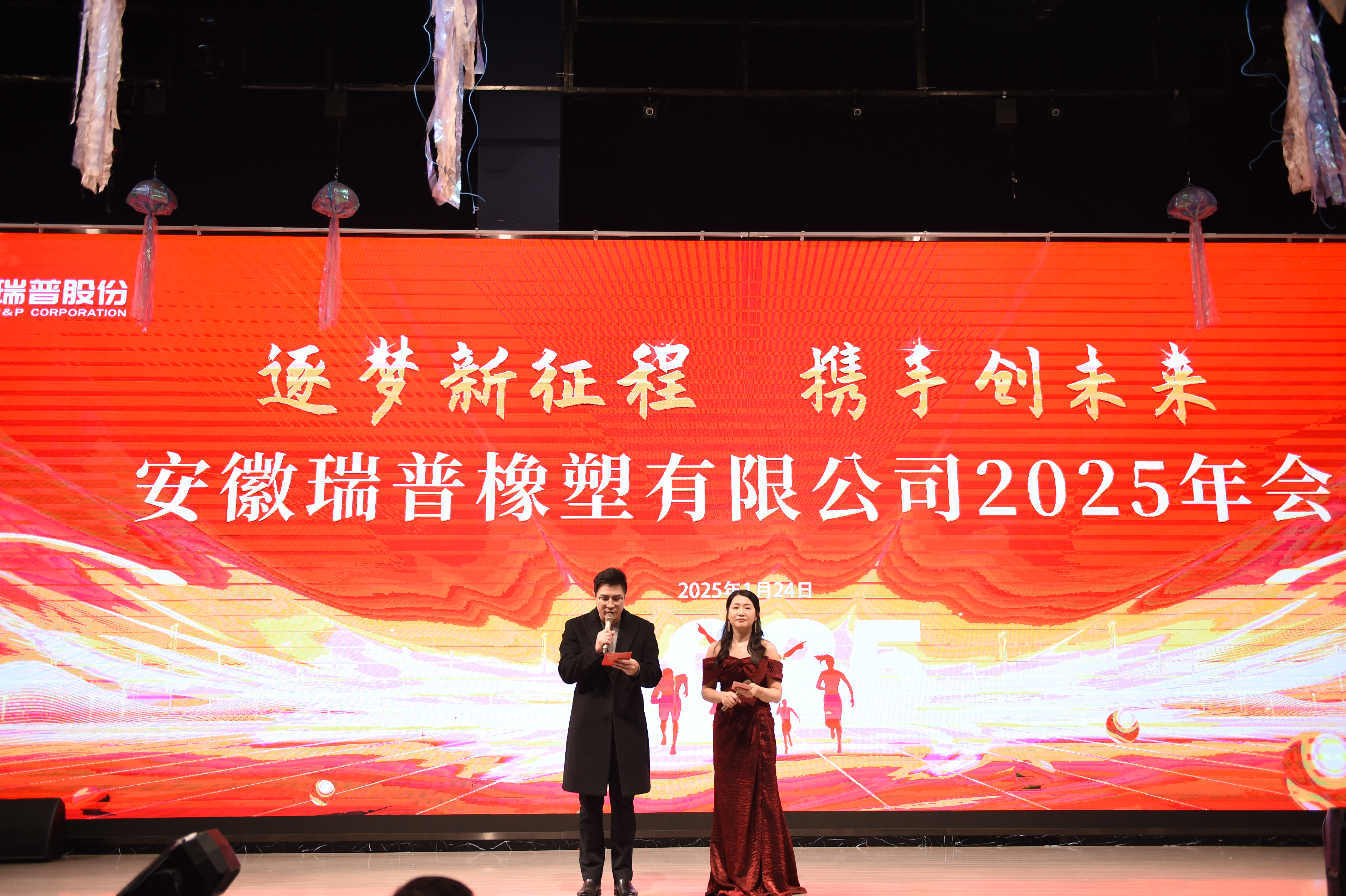 龍騰虎躍慶盛事,馬到功成事業興,安徽瑞普橡塑有限公司年會由國際貿易部經理和人力資源部經理擔任主持人,瑞普2024年會在倆位主持人簡單而又大氣的開場白下正式拉開序幕。